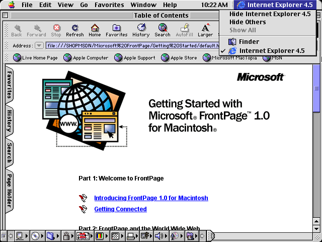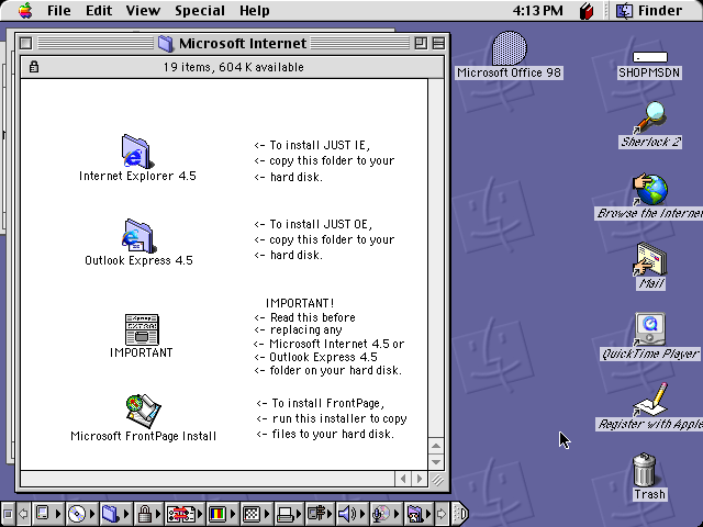 Microsoft Office 98 Macintosh Edition is a version of Microsoft Office for the classic Mac OS, unveiled at Macworld Expo/San Francisco on January 6, 1998. It introduced the Internet Explorer 4.5 browser and Outlook Express 4.5, an Internet e-mail client and usenet newsgroup reader, and FrontPage 1.0. Office 98 was re-engineered by Microsoft's Macintosh Business Unit to satisfy customers' desire for more Mac-like software.