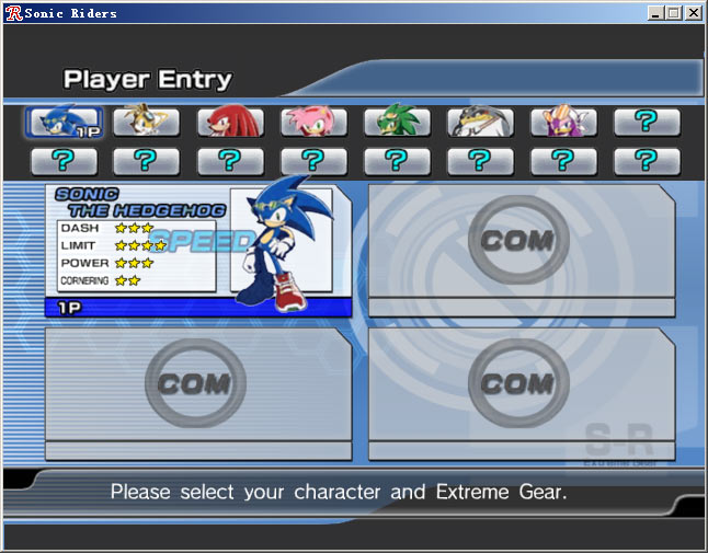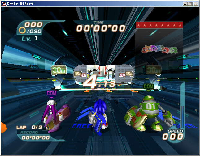 Sonic and friends speed through tracks on air boards, using individual special moves to strike down opponents. Air is a big element of Sonic Riders. Your board's "fuel" source is air. You can fill up your air at various points on the course, but to race well you'll have to use another means of replenishment: performing tricks with your board. You'll also want to make use of turbulence from racers who are in front of you.