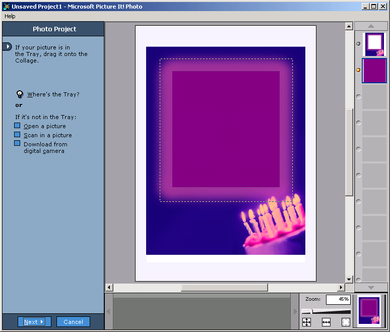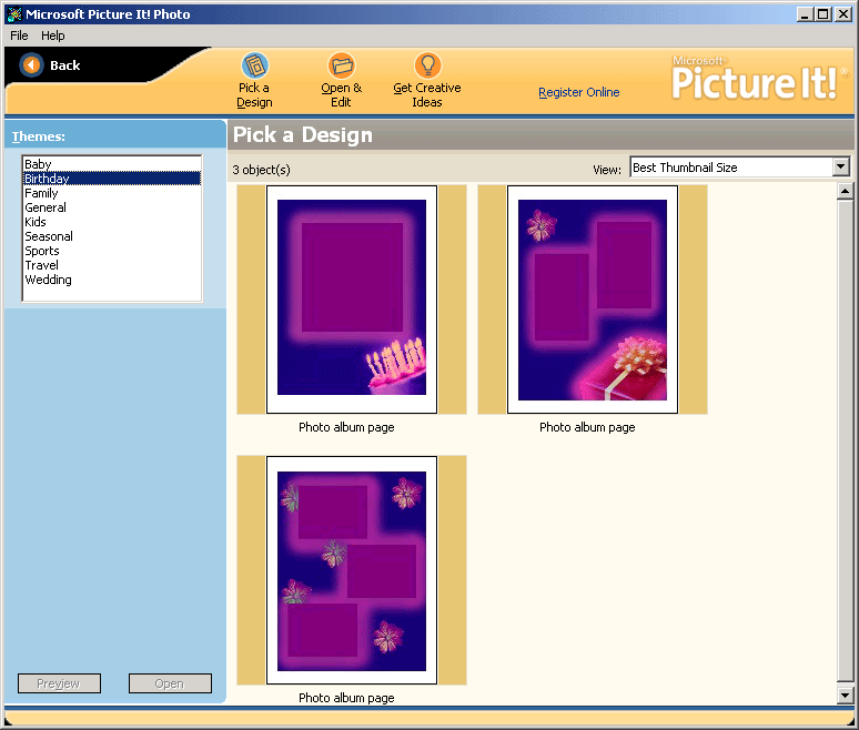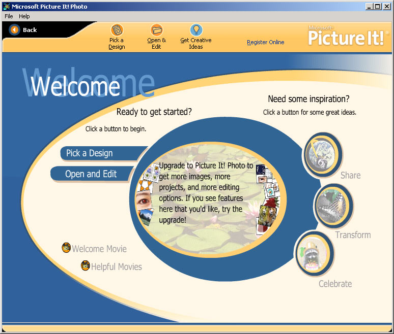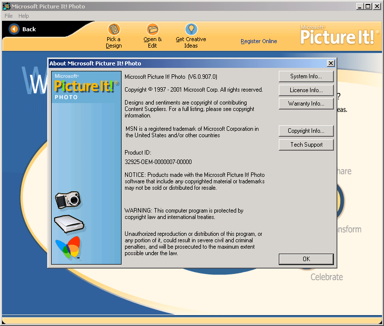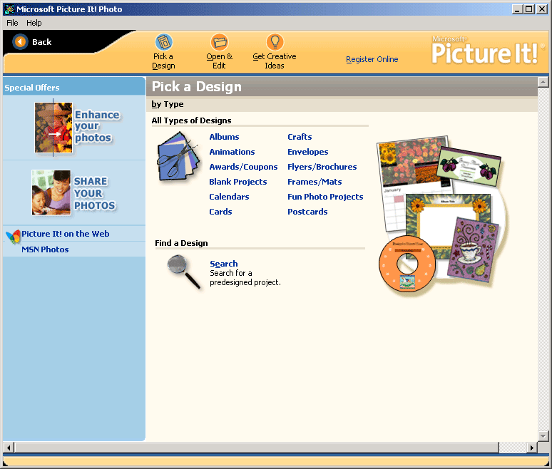 Microsoft Picture It! Photo Premium has the tools to retrieve photos from nearly any digital image source, and features advanced editing and special effects tools that let you create great photo projects. Use it with photos from just about anywhere--from a digital camera, CD, scanner, hard drive, or MSN Photos. The step-by-step movies and wizards show how to edit images and create all kinds of photo projects. You can then catalog the photos and projects in the gallery, letting you find them quickly later using the search feature and visual preview.