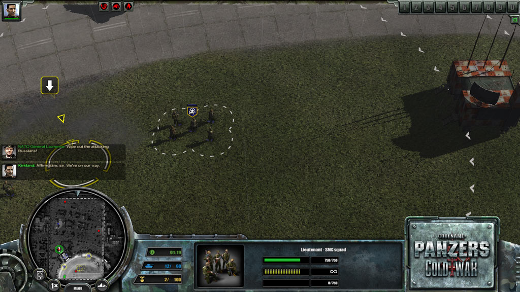 The player participates in an 18 mission long campaign on the American/German side of things with the US Army Lieutenant Douglas Kirkland and the German Freikorps Oberst Hans von Gröbel. As its predecessors, Codename: Panzers - Cold War is a tactical game and the player does not need to bother with resource management. A mission is started with pre-defined armies and more troops can be requested at a conquered helipad, train station, shipyard or road, through investing Prestige Points, which are handed out for completing mission objectives (primary, secondary or hidden ones), as well as by capturing and holding so-called Points of Interest scattered around the map.