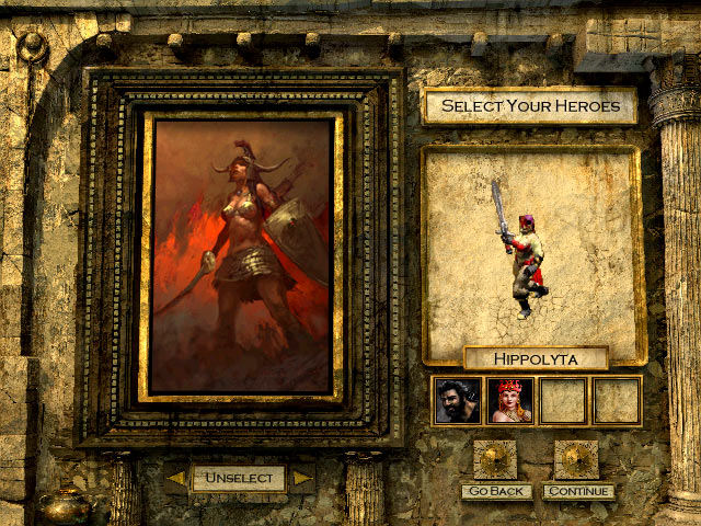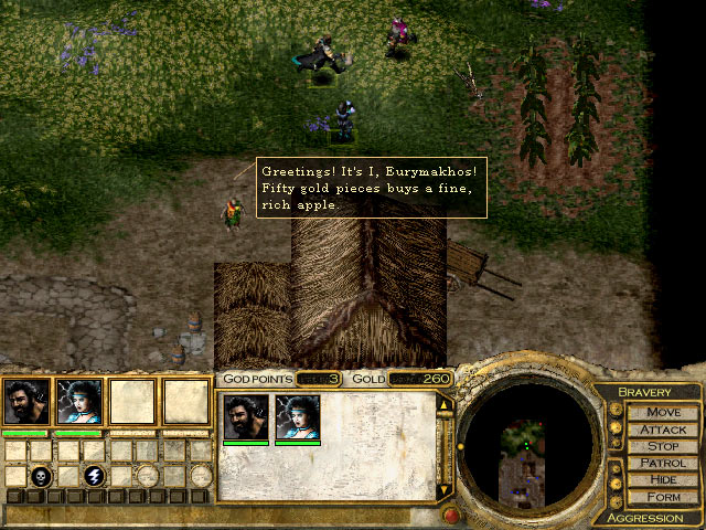 You start out controlling two heroes who progress through the game by earning experience and money that can be used to buy units (such as spearmen, gorgons, etc.). Each hero has an inventory and you can often search dead enemies for items such as health apples, etc. and an adjustable agression level to adjust your interaction to npcs.