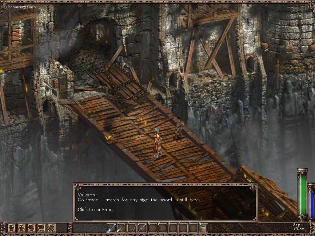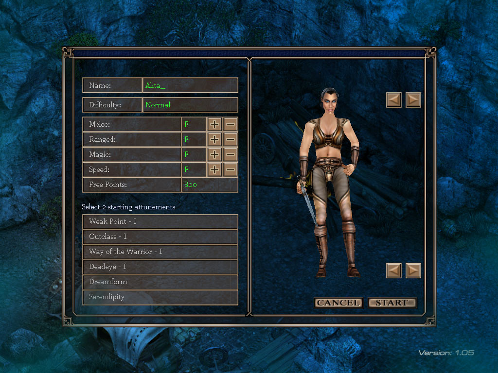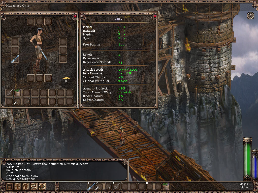 The game is played from a third person, isomorphic viewpoint with the main character at the center of the display. The primary character skills (melee, ranged, magic and speed) begin with relatively low ratings, but can be improved as the game progresses and the character gains levels of experience.